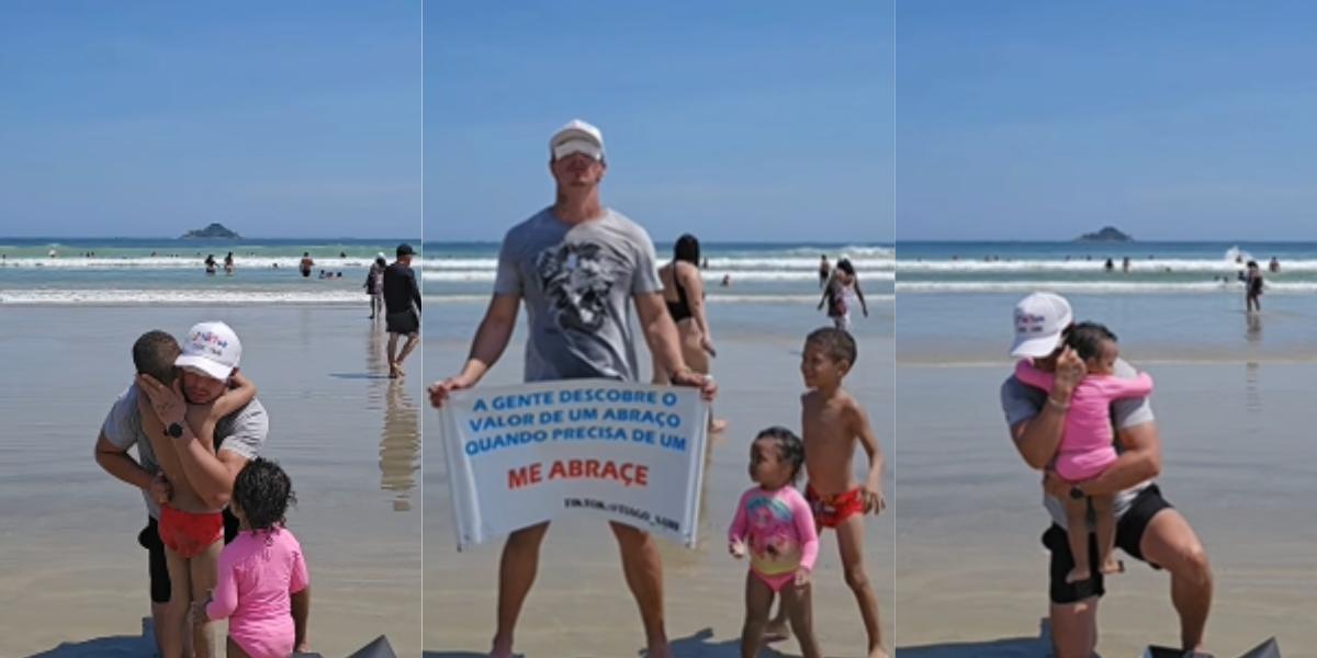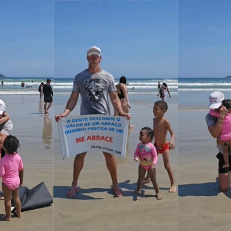 Influenciador viraliza ao dar abraços às cegas em crianças na Praia da Enseada, em Guarujá, litoral de São Paulo; VÍDEO