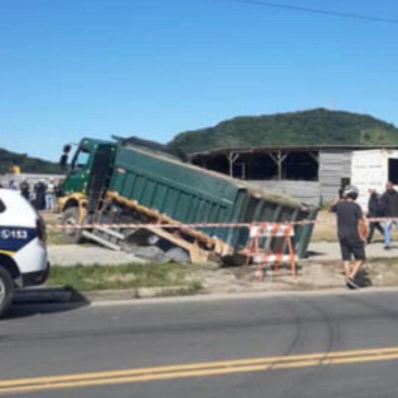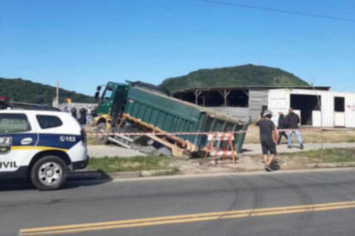 Cratera se abre em ciclovia de avenida e caminhão fica preso em Guarujá, no litoral de São Paulo