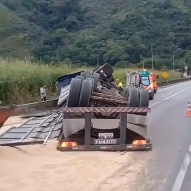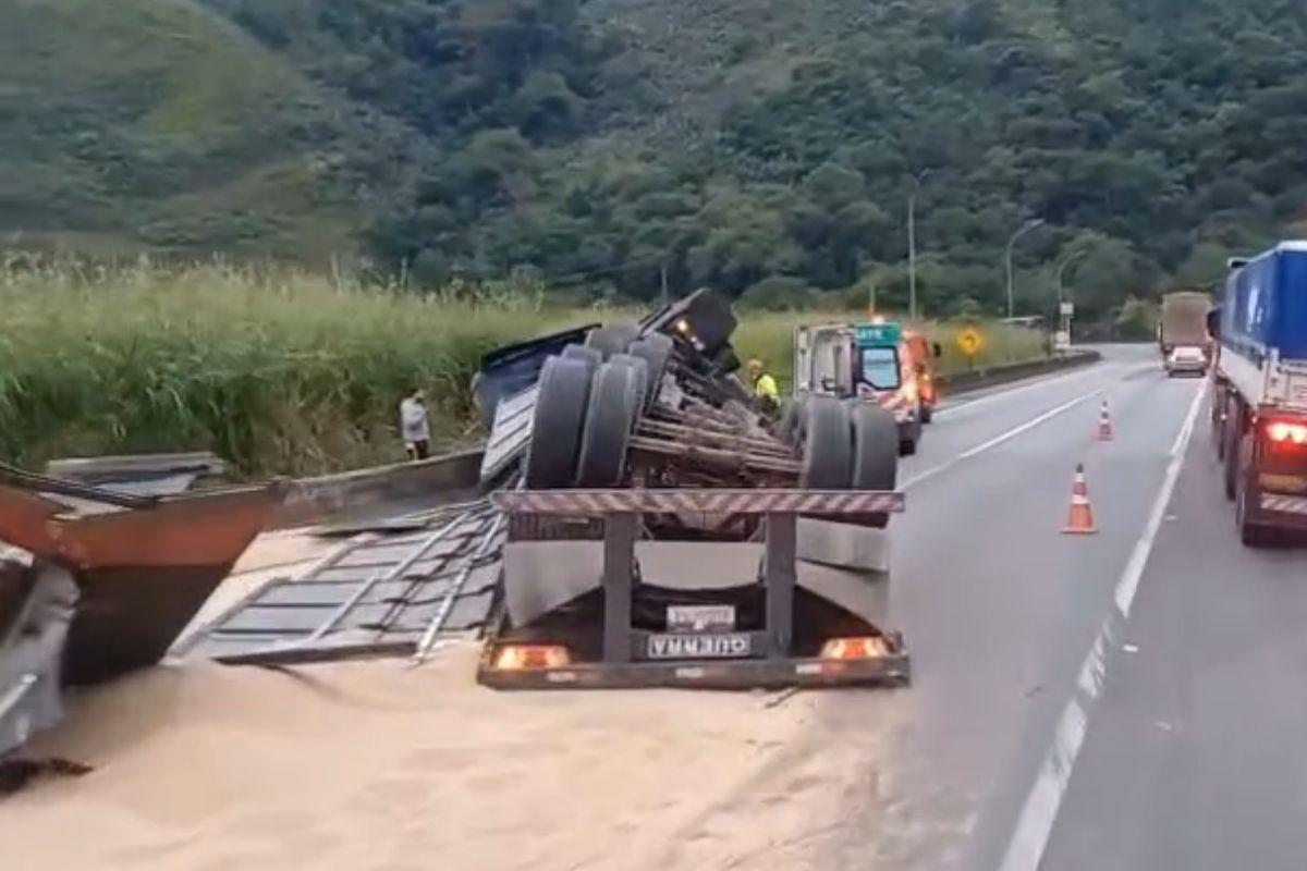 Caminhão com grãos tomba e bloqueia rodovia em trecho de serra