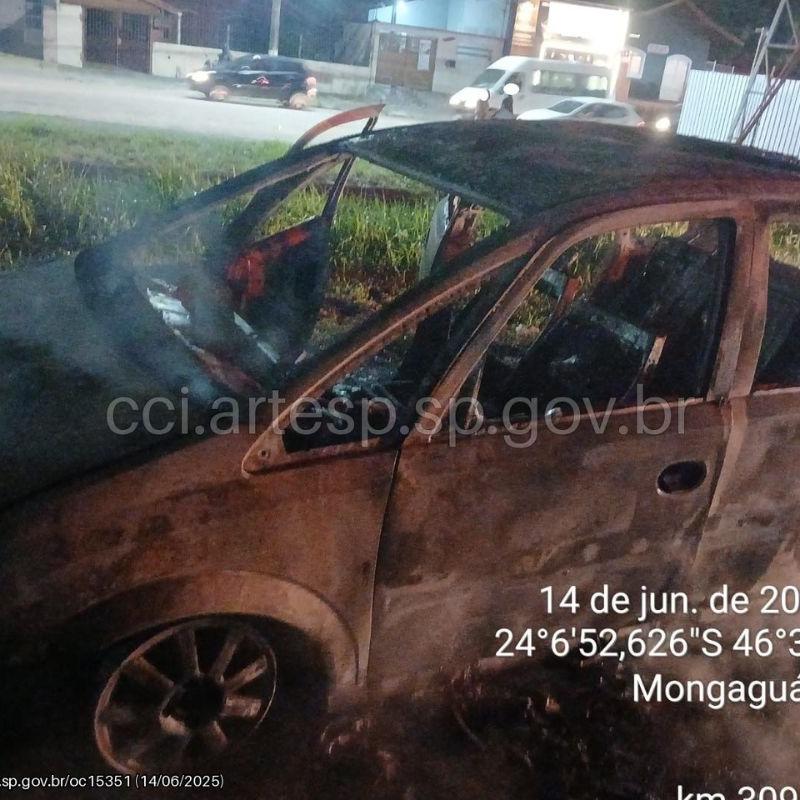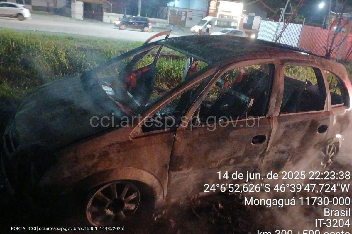 Carro é consumido por incêndio logo após mulher sair de posto de combustíveis na Baixada Santista